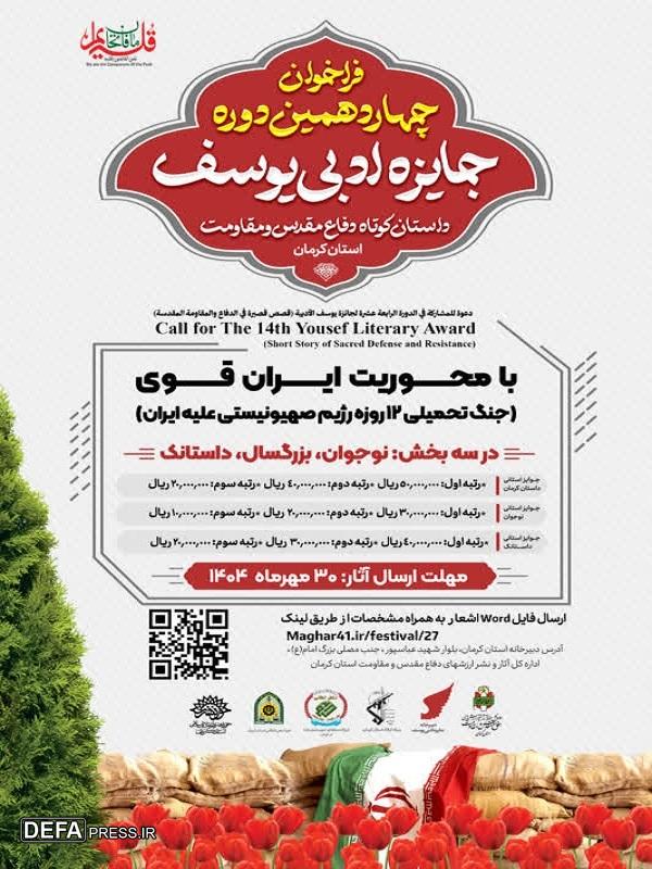 اداره کل حفظ آثار و نشر ارزشهای دفاع مقدس و مقاومت استان کرمان، فراخوان «جایزه ادبی یوسف» ویژه داستان کوتاه دفاع مقدس را برای سال ۱۴۰۴ منتشر کرد.