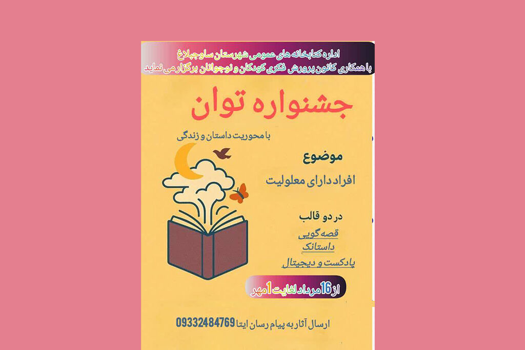 فراخوان جشنواره «توان» با محوریت داستان و زندگی افراد دارای معلولیت با همکاری نهاد کتابخانههای ساوجبلاغ و مرکز کانون پرورش فکری کودکان و نوجوانان در هشتگرد، منتشر شد.